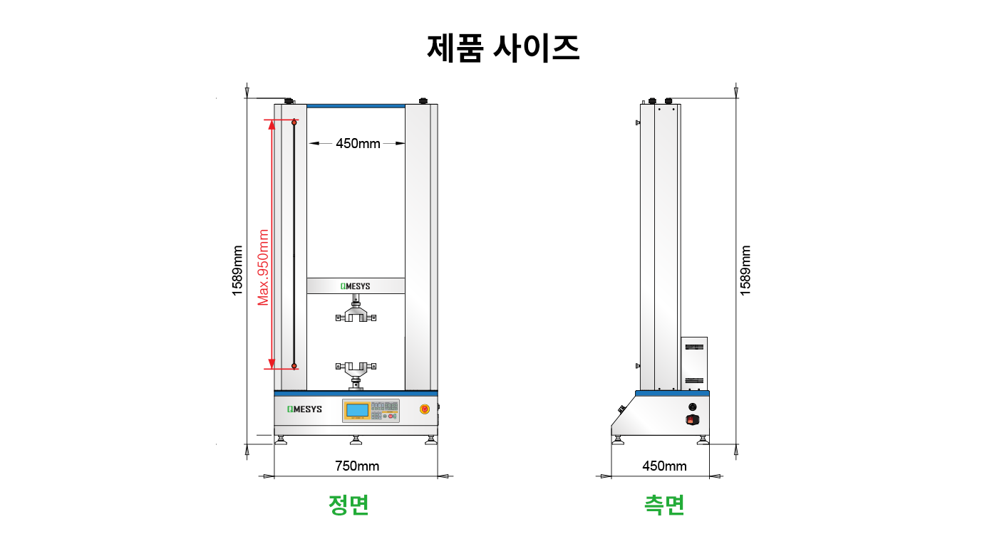넓고 큰 시험편과 소재에 따른 다양한 Grip을 자유롭게 선택하여 사용할 수 있고 최대 이송거리 950mm(Non-Grip)로