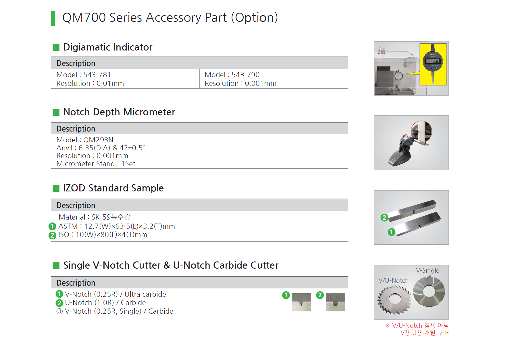 QM700N은 오리지널 노치 칼날(45±0.5˚와 0.25R±0.05mm/초경/Japan)을 장착한 수동 노치머신으로